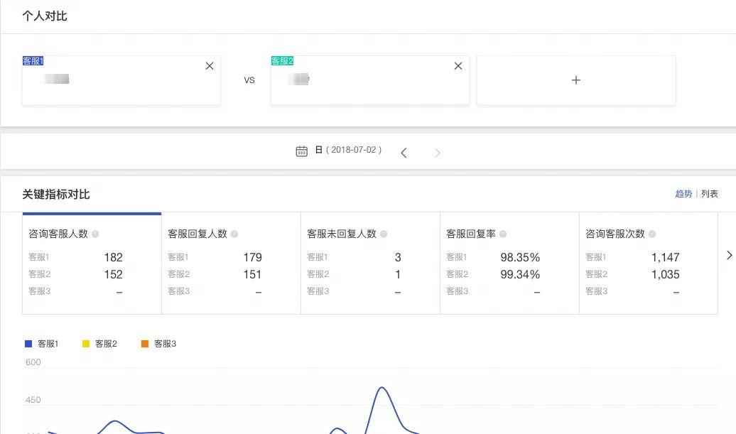 如今,有了量化考核,掌柜不仅可以看到单个客服的工作业绩,还可以同时调出多个客服的业绩数据进行对比,同台“pk”。比如点击关键指标对比,在咨询客服人数这一栏,掌柜可以看到各个客服在指定日期的所服务人数。