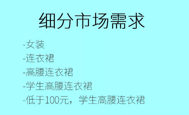 服装市场非常大,首先进行切分,锁定连衣裙这个市场。但其实连衣裙还是非常大,我们可以再次进行切分,比如款式细分:高腰连衣裙。款式细分完了之后还可以继续年龄段细分,淘宝代运营举例说学生穿的高腰连衣裙;还能继续进行价格细分,比如100元以下,学生,高腰连衣裙。