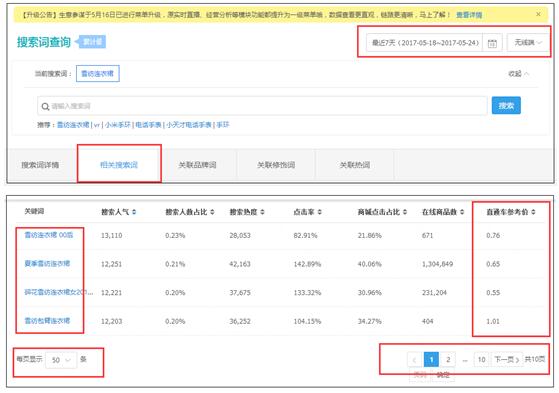 我们打开生意参谋——市场(标准版以上)——搜索词分析——搜索词查询——输入“雪纺连衣裙”,选择最近7天的数据,选择无线端,然后在“相关搜索词”这个功能模块,生意参谋的市场行情一共会给你推荐500个词,全部都是围绕这“雪纺连衣裙”的。