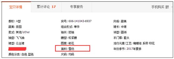 然后就是为了提高点击率和转化率,你在车图的设计和详情页设计上也都应该围绕着核心权重词。比如消费者搜索“雪纺连衣裙”,那么这个关键词的转化点就是“面料一定要是雪纺的”,所以,首先你的属性不能放错吧: